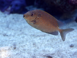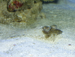 Dies macht er meistens nachts und die aufgewirbelten Sandpartikelchen sind bei Sonnenaufgang schon nicht mehr zu sehen. Dann geht er schlafen und bedeckt sich mit Sand, so dass nur die Augen und die Schwanzspitze zu sehen sind (siehe Foto). Das Wichtigste für die Pflege dieses Tieres ist daher viel Schwimmraum und feiner Sand zum Eingraben.