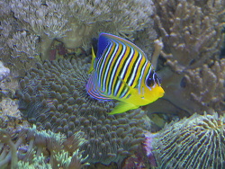 Bei der Fütterung kommt sie sogar ganz raus und schwimmt im Becken umher, um vor der Sternchenmuräne und dem Rochen ihr Stückchen Fischfilet zu ergattern. Nach 3 - 4 Happen ist sie dann meistens satt und zieht vondannen.