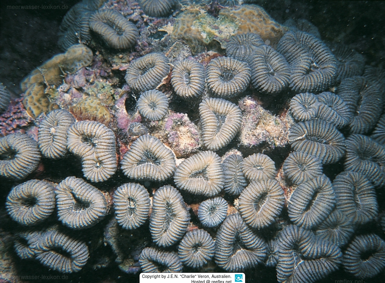 Characters: Colonies have tubular (phaceloid) corallites and are corallites and are often over one metre across. Individual corallites or small groups of corallites are usually not connected or have dead basal connections and are readily broken apart and scattered. Corallites are rounded, averaging 15-20 millimetres diameter and vary in shape as illustrated. Septa of living colonies have rounded, bead-like, dentations.