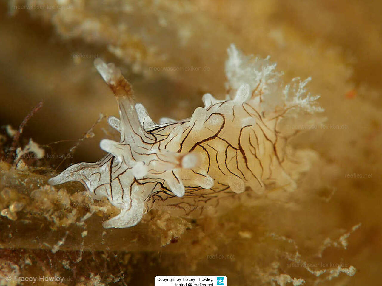 The body is narrow with eleven or twelve pairs of short lateral papillae,and a few papillae between rhinophores and gills. The body is translucent with a reticulate pattern of brown lines.