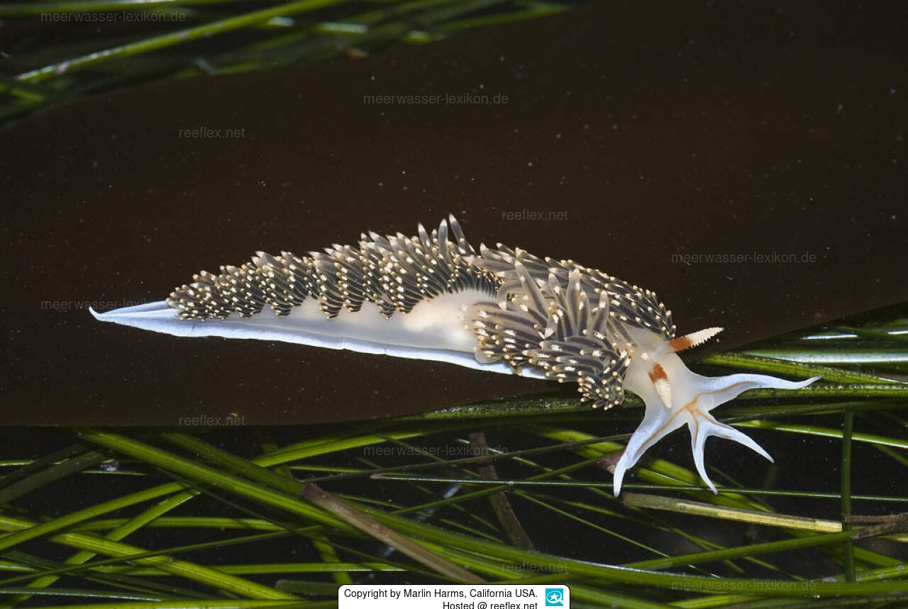 The background colour is white.On the body are long purple and brown cerata.Characteristic for Phidiana hiltoni is a reddish or brownish line across the head.