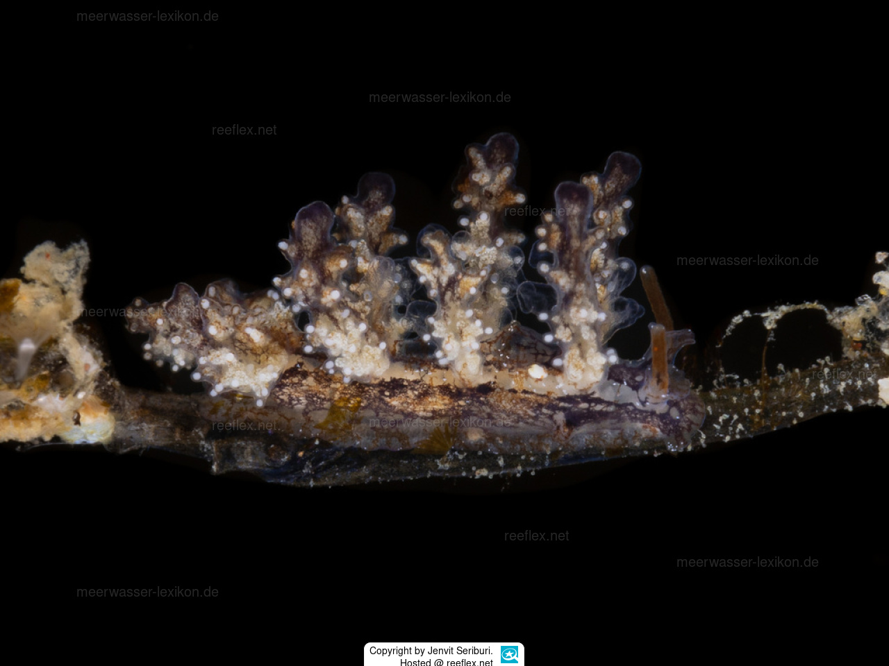 The body is translucent with longitudinal stripes.The stripes are with brown pigment. The cerata are irregular in shape. This nudibranch was found on colonies of a Sertulariid hydroids.